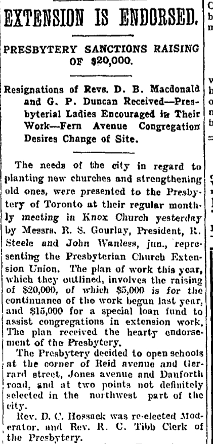 …The needs of the city in regard to planting new churches and strengthening old ones, were presented to the Presbytery of Toronto at their regular monthly meeting in Knox Church yesterday by Messrs. R. S. Gourlay, President, R. Steele and John Wanless, jun., representing the Presbyterian Church Extension Union. The plan of work this year, which they outlined, involves the raising of $20,000, of which $5,000 is for the continuance of the work begun last year, and R15,000 for a special loan fund to assist congregations in extension work. the plan received the hearty endorsement of the Presbytery.