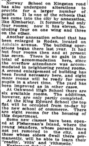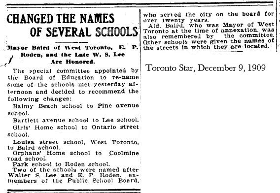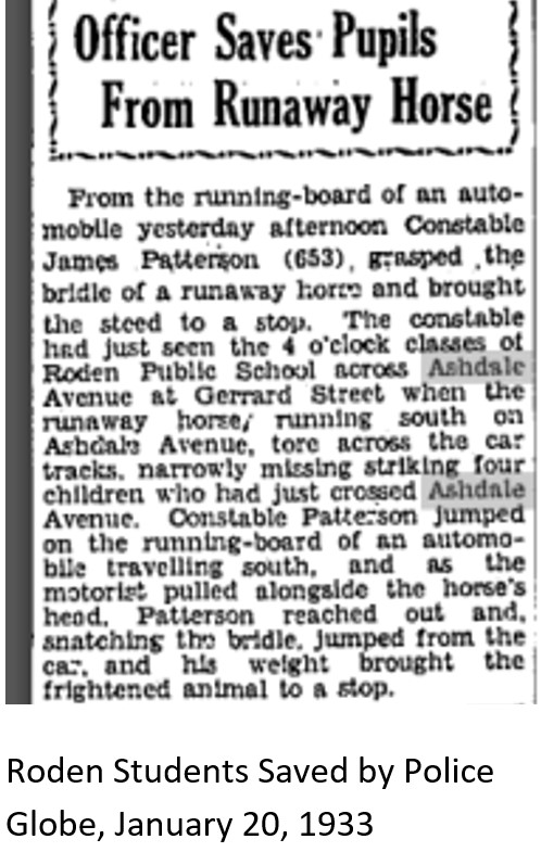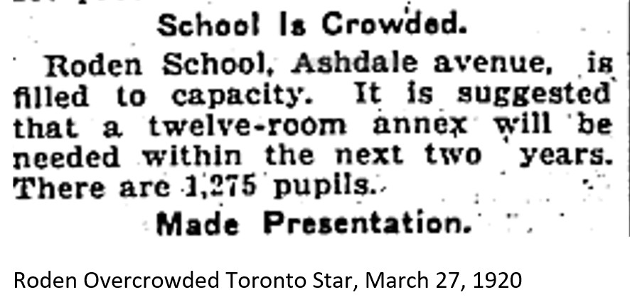 Addition to Roden School Globe, February 11, 1920Opening of Ashdale school, Windsor Star, January 13, 1908. In 1908 when the Ashdale School was built and opened, the area was not in the City of Toronto but in the Township of York. York Township appointed a woman as principal, probably saving money by doing so as female principals and teachers were paid a fraction of what men made teaching.Naming a school for Roden Toronto Star, 09 Dec 1909Midway Schools , Ashdale School renamed Roden in early January 1910, Globe, April 6, 19091910 CENTENNIAL STORY – THE BOARD OF EDUCATION FOR THE CITY OF TORONTO, 1850-1950 E P Roden ChairmanAshdale School renamed Roden, Globe, January 4, 1910Crap shoots Roden1910 Roden Public School, Ashdale Avenue, west side, north of Gerrard Street East, infant classRoden School undated1910 Midway Schools on water sewage, Toronto Star, February 19, 1910Principal Ashdale School Toronto Star, April 19, 1910 Principal Ashdale School Toronto Star, April 19, 1910 Principal Ashdale School Toronto Star, April 19, 1910 Principal Ashdale School Toronto Star, April 19, 1910 Principal Ashdale School Toronto Star, April 19, 1910 Principal Ashdale School Toronto Star, April 19, 1910 Principal Ashdale School Toronto Star, April 19, 1910 Principal Ashdale School Toronto Star, April 19, 1910 Roden Public School, Ashdale Avenue, west side, north of Gerrard Street East, infant class, 1911 TPLOvercrowding Roden School, Toronto Star, March 29, 1911Permit for new Roden school building, Globe, June 2, 1911Roden School, Globe, September 5, 1911Roden District Ratepayers Formed, Toronto Star, February 14, 1919Roden District Ratepayers Formed, Toronto Star, February 14, 1919Athletic grounds & playgrounds Toronto Star, March 5, 1919 Athletic grounds & playgrounds Toronto Star, March 5, 1919 Athletic grounds & playgrounds Toronto Star, March 5, 1919 Roden School, 310 Ashdale Avenue — playground – June 16, 1919Addition to Roden School Globe, February 11, 1920Roden School 310 Ashdale Ave playground, June 16, 1919 Roden School, 310 Ashdale Avenue — playground – June 16, 1919Addition to Roden School Globe, February 11, 1920Evening classes Roden Toronto Star, September 30, 1921Property bought for Roden School sold to library, Toronto Star, Jan. 27, 1922Roden Students Saved by Police, Globe, November, 1933Roden Students Saved by Police, Globe, January 20, 1933 Roden School Helps Bomb Victims, Toronto Star, March 7, 1942Roden student, Globe and Mail, October 1, 1946Waste paper, Roden School, Toronto Star, January 31, 1946Roden School Community Centre, Toronto Star, October 1, 1948Roden students Globe and Mail, November 24, 1949Roden students Globe and Mail, November 24, 1949Roden students Globe and Mail, November 24, 1949Roden students Globe and Mail, November 24, 1949Roden students Globe and Mail, November 24, 1949 Playing Baseball Roden Schoolyard 1950s, photo by Robert WakelinRoden Avenue Grade 3, 1950sLacrosse, Roden School, Toronto Star, April 5, 1951Fans Run Interference,, Globe and Mail, October 30, 1962City Schools Compete in Chess Test, Globe and Mail, February 27, 1956City Schools Compete in Chess Test, Globe and Mail, February 27, 1956Fans Run Interference,, Globe and Mail, October 30, 1962Fans Run Interference,, Globe and Mail, October 30, 1962Fans Run Interference,, Globe and Mail, October 30, 1962Fans Run Interference,, Globe and Mail, October 30, 1962Fans Run Interference,, Globe and Mail, October 30, 1962Fans Run Interference,, Globe and Mail, October 30, 1962Schools obsolete (Roden), Toronto Star, July 23, 1968Free furniture, Roden School, Toronto Star, July 4, 1970Free furniture, Roden School, Toronto Star, July 4, 1970Free furniture, Roden School, Toronto Star, July 4, 1970Free furniture, Roden School, Toronto Star, July 4, 1970Roden schoolyard in winter, January 1, 2010 by Joanne DoucetteSchoolyard Roden and Equinox Schools September 29, 2020 (COVID classrooms with social distancing outside)2021 Orange shirts Roden School, September 30, 2021, by J. Doucette2025 Plaque Roden School