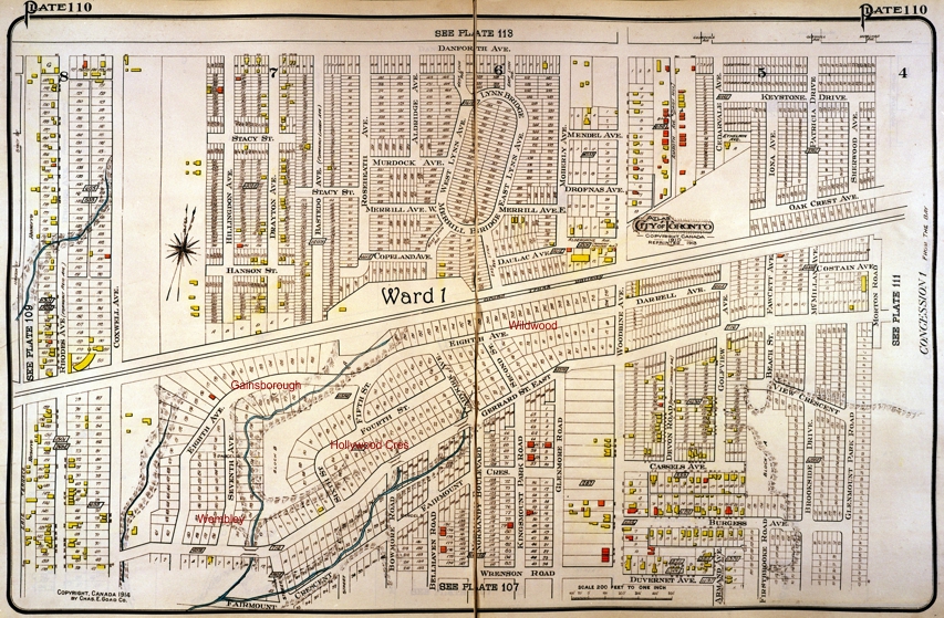 In 1909 the City of Toronto annexed the area south of the Danforth between Greenwood Avenue and the Town of East Toronto, allowing Toronto to expand eastward. Toronto City Estates incorporated in a partnership that would make Frederick Robins the real estate agent for almost all sales from Greenwood to Woodbine Avenues. Pellatt was a director of the Home Bank which lent millions to the Pellatt’s enterprises apparently without the knowledge of other directors.