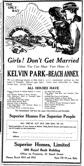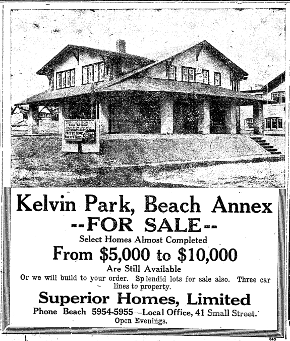 Providential Investment Company and Superior Homes took over the sale of Kelvin Park. Sales skyrocketed and houses went up to line the streets where they still stand today. Two show homes graced Kelvin Park: a classic Arts and Crafts bungalow and a hip-roofed home, known as “the Electric House”, used to showcase electric lighting, heating, and appliances. Sales of electric appliances and homes skyrocketed. Although the name Kelvin Park has been forgotten, the houses built from 1923 to 1929 still line the streets that lie where the greens and fairways of the old Toronto Golf Club were.