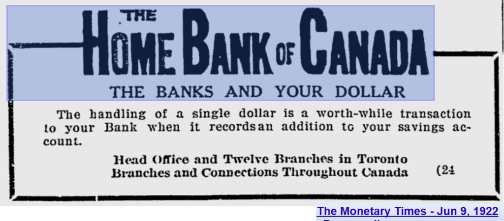 Five Canadian banks failed between 1905 and 1908. The failure, in January 1908, of the Sovereign Bank was the biggest, but not the last Canadian bank to fall. Bankers feared a domino effect. One of the banks Pellatt was involved with was the Home Bank of Canada, founded in 1903. It grew out of the Home Savings and Loan Company, created in 1854 to serve Toronto’s Catholics.