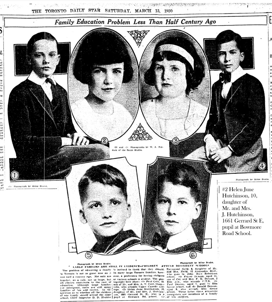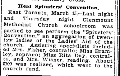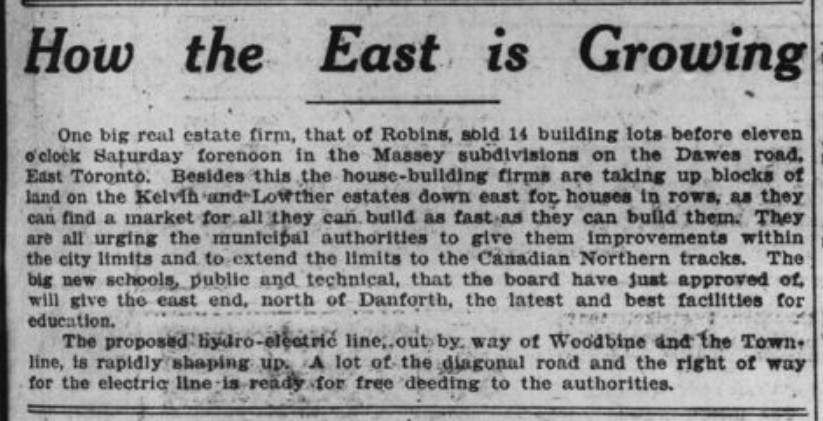 Golfview Avenue, Globe, March 15, 1912How the East is Growing Toronto Sunday World, March 15, 1914Spinsters Convention Glenmount Toronto Star, March 15, 1919Heavy mare 380 Ashdale, Toronto Star, March 15, 1919Helen June Huchinson, Bowmore Road School, family of 10 Toronto Star, March 15, 1930 Toronto Star, March 15, 1922 WilliamsonWoodbine Avenue looking south from south of Merrill, March 15, 1965 by James V. Salmon, TPL