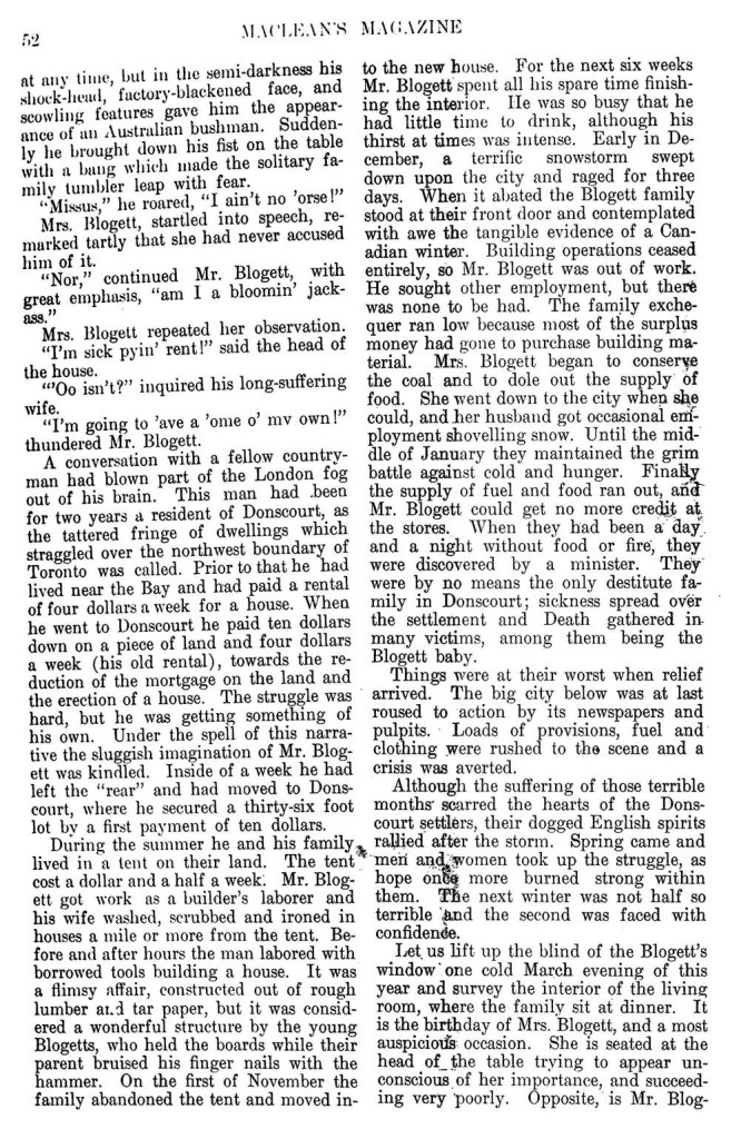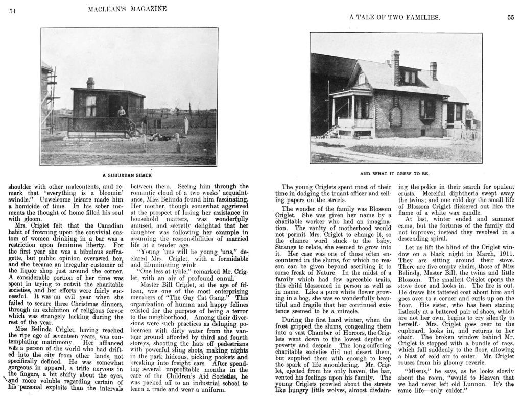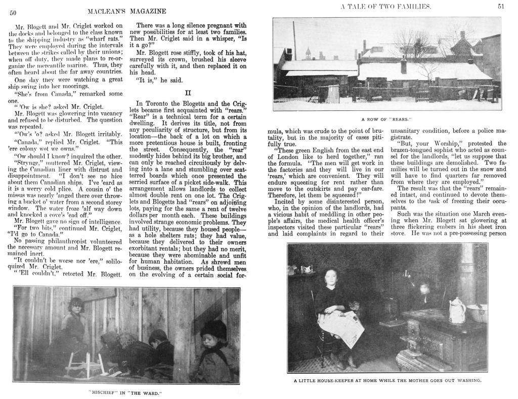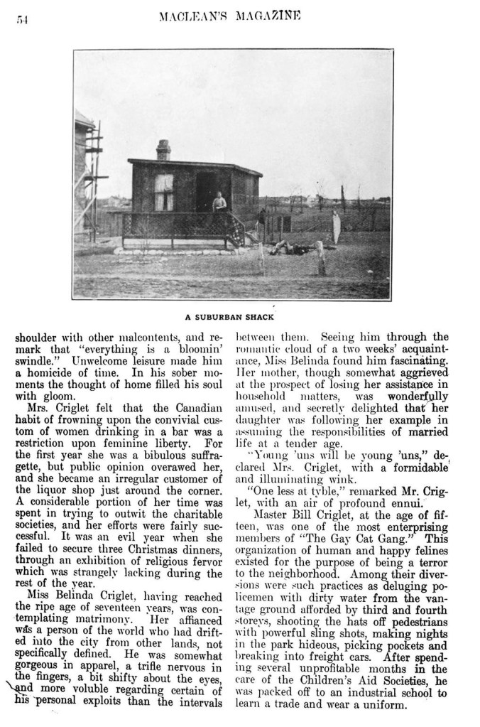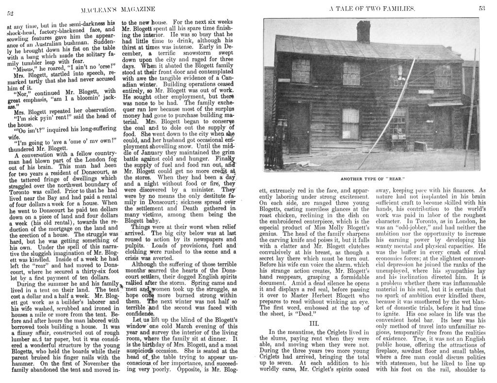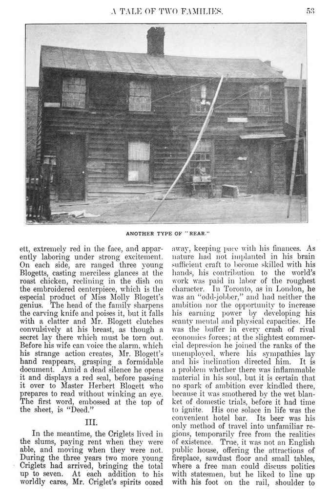 This story is about an immigrant family who went from living in a tarpaper shack in a Shacktown (like that of Gerrard-Coxwell’s neighbourhood). They worked hard and “made good” going from their humble home to a comfortable well-built house. When I was growing up outside of Toronto an immigrant family moved into a chicken coop next door to us. It was a tarpaper shack too, a smelly one at that. But the whole family worked hard and over time the tarpaper shack too became comfortable bungalow. Happy memories!