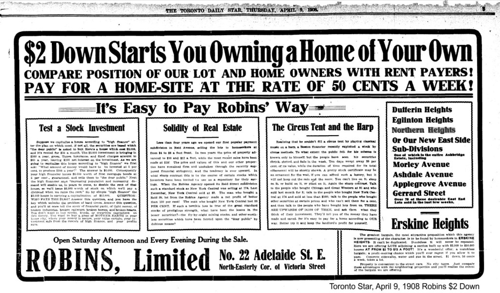Subdivision of the Ashbridge’s Farm and sale by Robins Ltd., 1908