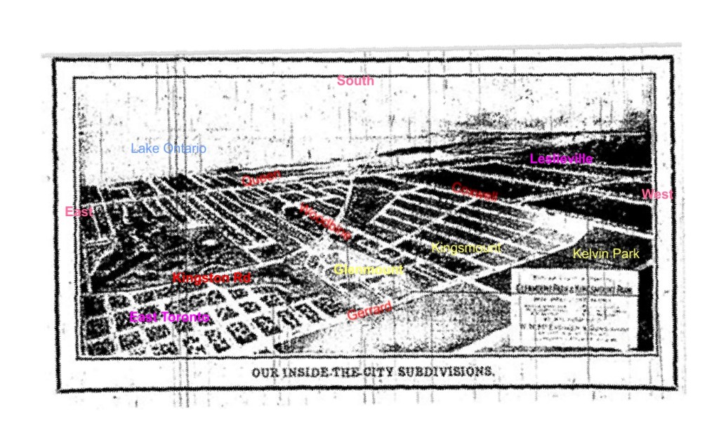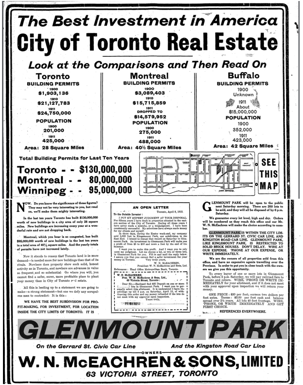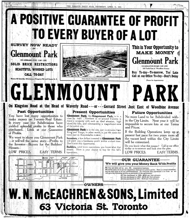 Glenmount ad, Toronto Star ad, April 11, 1912Aerial view, Glenmount and Kingsmount Park, Toronto Star, April 11, 1912Glenmount aerial labelled, Toronto Star ad, April 11, 1912Glenmount map, Toronto Star, April 11, 1912Glenmount Park ad, Globe, April 10, 1912