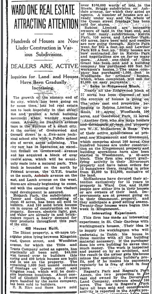 Break in, 476 Rhodes Ave, Globe, April 14, 1913Danforth area Toronto Star, April 14, 1920Norway School, Toronto Star, April 14, 1924 15 18 and 20 Ashdale Ave, Grimshaw sold to W.H. Westman, Toronto Star April 15 1920Bowmore Road, War threatens, Globe & Mail, April 15, 1938Bungalow from Martin Senour paint ad, Maclean’s, April 15, 1923Bungalow from Martin Senour paint ad, Maclean’s, April 15, 1923Girls Don’t Get Married – Kelvin Park Toronto Star, April 15, 1922425 Coxwell Ave. Herbert Hosiery, The Ottawa Citizen, April 16, 1953Cridlands ad, Toronto Star, April 16 1953McEachren ad, Globe, April 16, 1914Flemish giant and other kinds of young rabbits, 168 Ashdale, Toronto Star, April 17, 1919E H Foster wounded Toronto Star April 17 1918Monarch Park ad Toronto Star, April 17, 1912Monarch Park ad Toronto Star, April 17, 1912Real estate, Toronto Star, April 17, 1920Sugar dumped, Globe and Mail, April 17, 1940Fred Scott killed by streetcar Hillington Ave, Owen Sound Daily Sun Times, April 18, 1940Scott killed by streetcar Hillingdon & Danforth, The Kingston Whig Standard, April 18, 1940Ulster Stadium offered to the City for $33,000, Toronto Star, April 18, 1944Ward One Real Estate, Toronto Star, April 18 1914