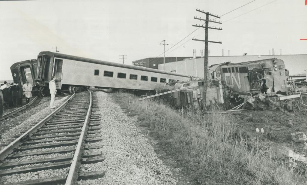 CNR Tempo train lies scattered across the railway right-of-way year Woodbine Racetrack after running through an open switch April 20, 1969 by Bob Olsen, Toronto Star