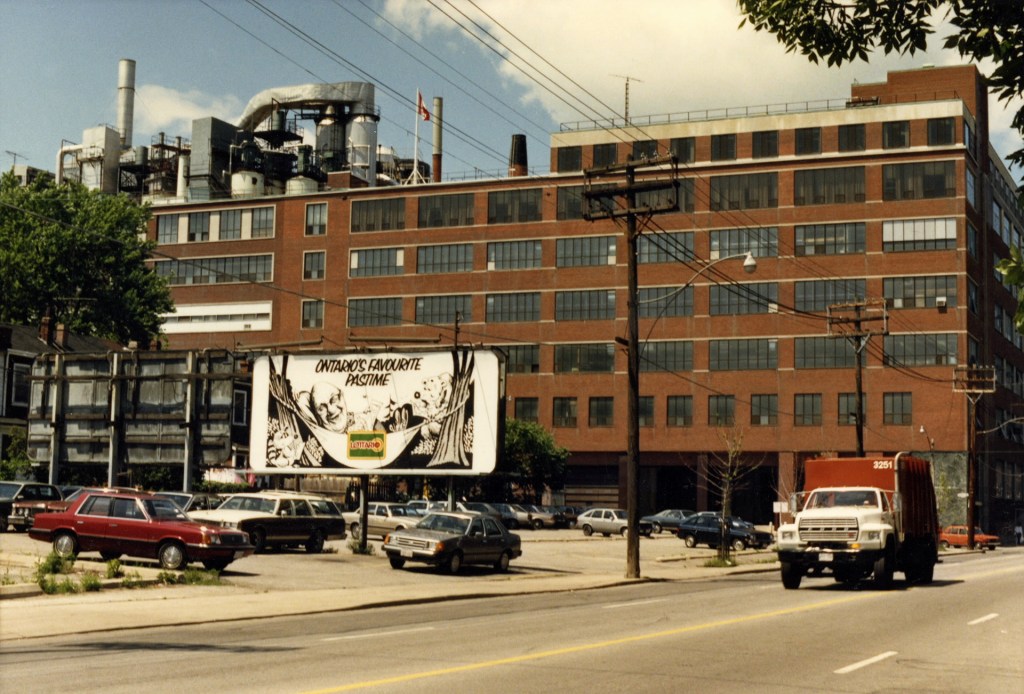 Palmolive Soap Co. from 1925 Might’s DirectoryAd from the Goblin, a University of Toronto student newspaper, September 1926Item is a photograph of two billboards, one on the side of a building occupied by the manufacturers of Palmolive Soap, identified as being located on Natalie Street., 1929 .Colgate Palmolive, Toronto Star, March 31, 1949Colgate 1986 TPL Photographer unknownThe condo where the Colgate-Palmolive factory once stood, photo by Joanne Doucette