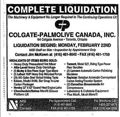 Complete Liquidation, Globe and Mail, February 13, 1993Early Colgate adArchitect’s rendering of the proposed factory on Carlaw Avenue. The skill is distorted and the images in the background have nothing to do with the actual location of the Palmolive factory.