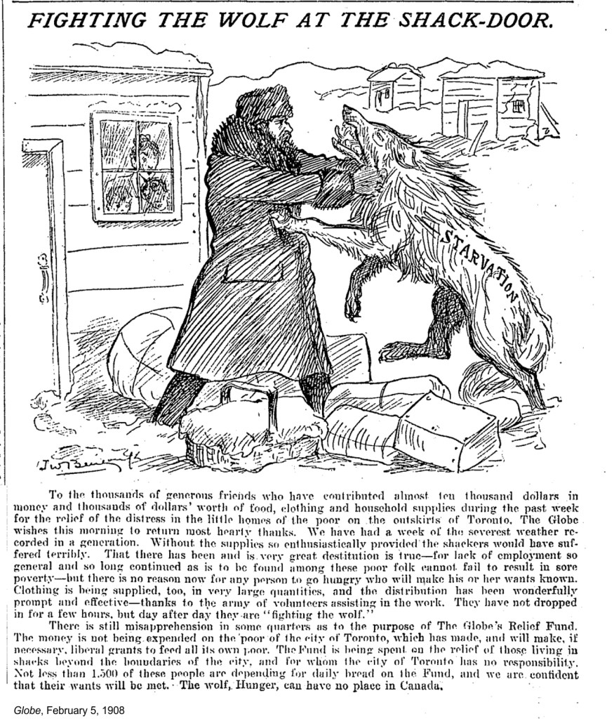 Unemployed, without food, fuel and proper clothes for the first hard Canadian winter, the British immigrants began to suffer intensely. Shacktown had no government, no charities, men out of work, women worn out. Globe reporters found families without any fuel, with nothing it, with frost bitten, and members critically ill without doctor’s care or medicine, or even blankets. Some people were still in tents.