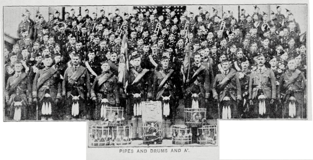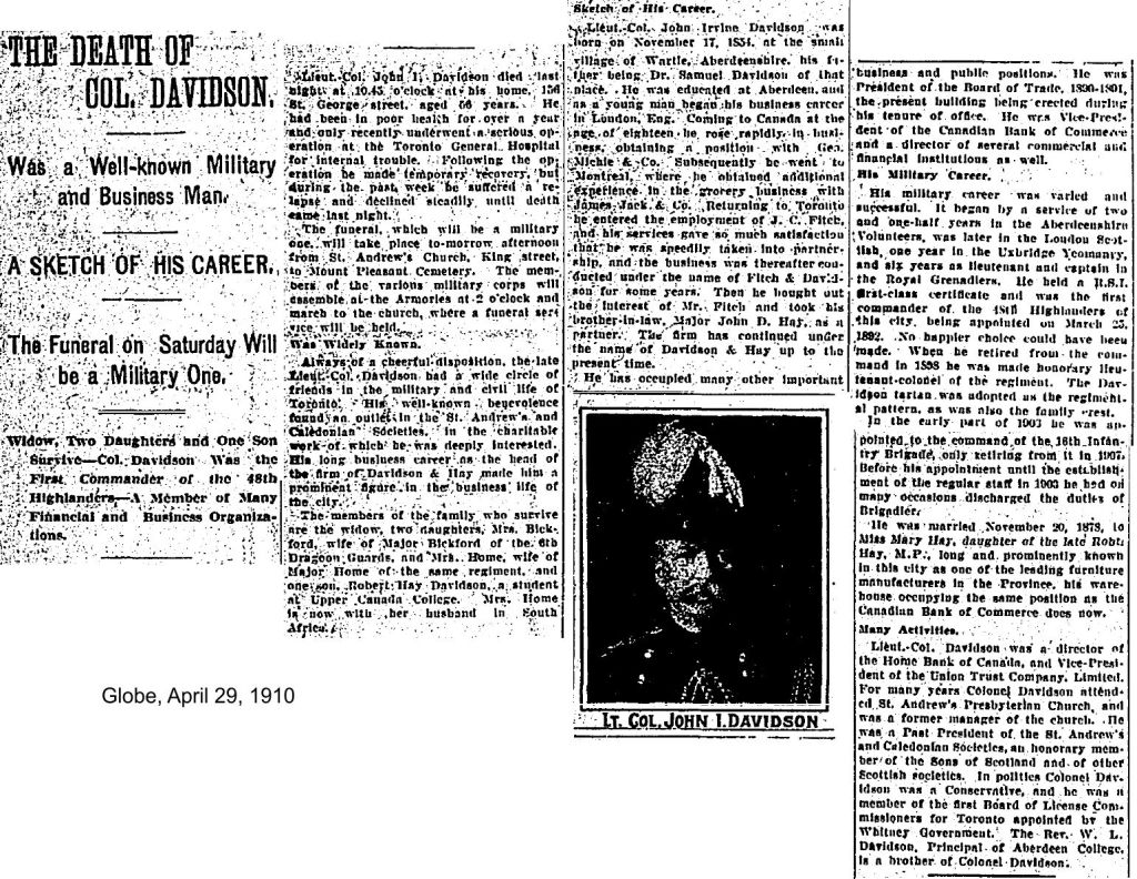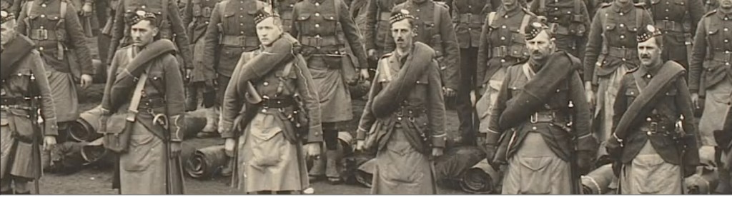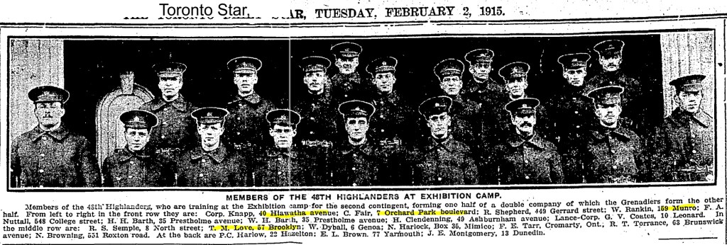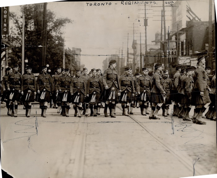 Many Midway residents eagerly enlisted in World War One, many choosing the 48th Highlanders. Founded in 1891, this Militia infantry regiment is based in downtown Toronto. They wear kilts of the Old Davidson tartan and a falcon’s head crest to honour their first Commanding Officer, John Irvine Davidson. Their motto is Dileas gu brath (“Faithful Forever”).