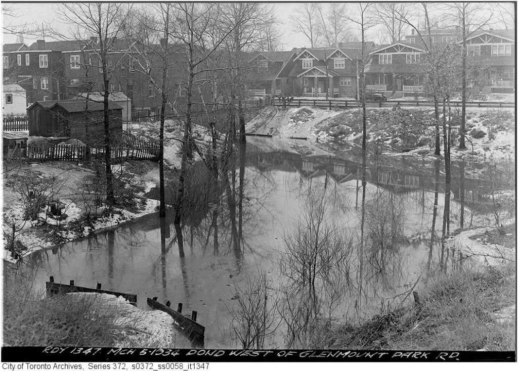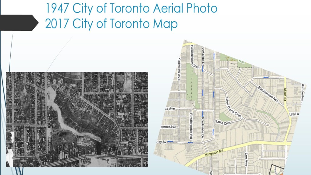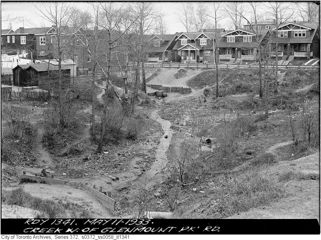 Tomlin’s Creek began where springs ran out of the sand and gravel banks just west of Main Street and south of Benlamond. It is now a “lost creek”, rerouted into the City of Toronto’s sewer system. But it still exists as a ghost creek running as ground water along the ravine.