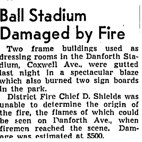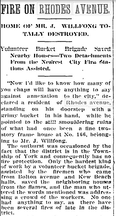 The glue factory on Danforth Road burned down on September 22, 1900, causing about $6,000 worth of damage, a considerable sum at the time. The factory was a three-story brick building, 125 feet long and 60 feet wide, just outside the city limits, on “glebe land”. About 40 men were thrown out of work by the fire. Toronto Star, Saturday, September 22, 1900