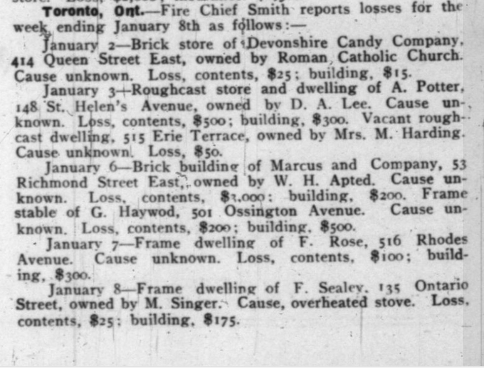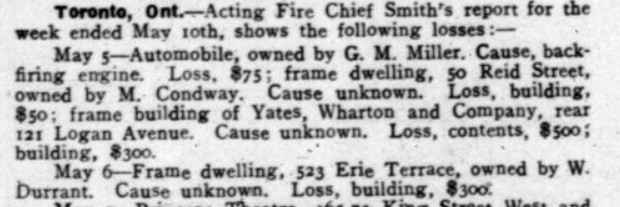 William “Stinky” Harris’s glue factory at Coxwell and Danforth was susceptible to fire as fats and oils rendered from animal carcasses are very inflammable. Sometimes our neighbourhood even appeared in the Big Apple news: Losses by Fire. Toronto, Ontario, Sept. 22—Harris’s glue factory, on Danforth Avenue, was completely destroyed by fire this morning. Loss,$25,000.00; partially insured. New York Times, September 23, 1900.