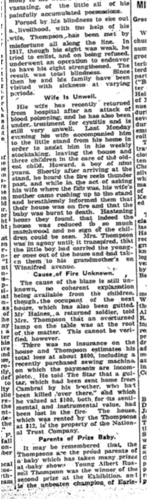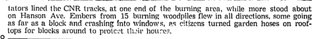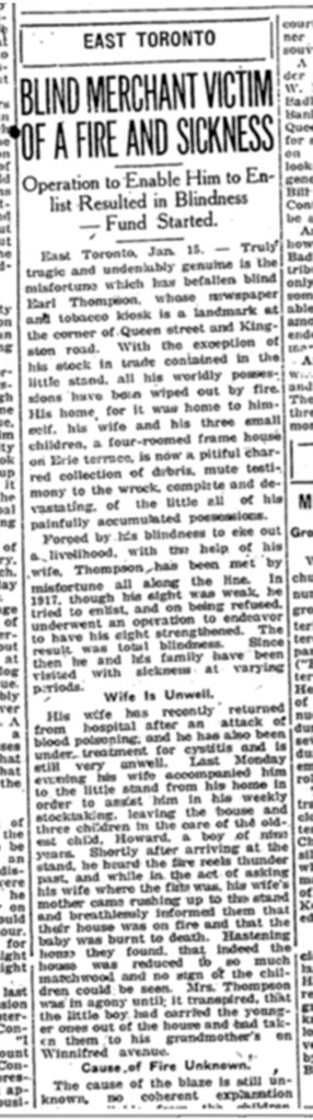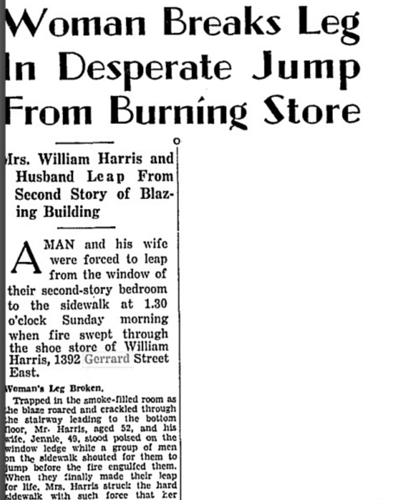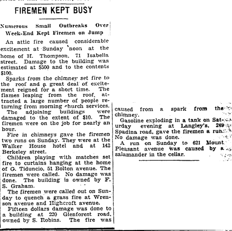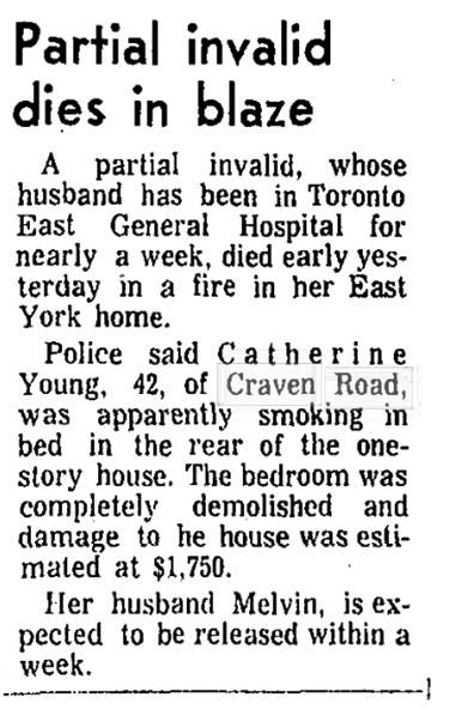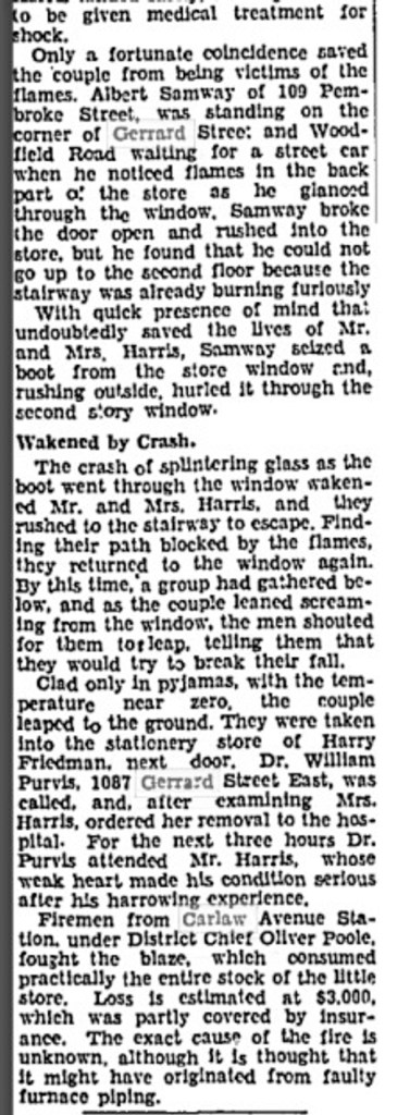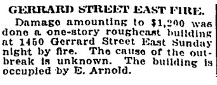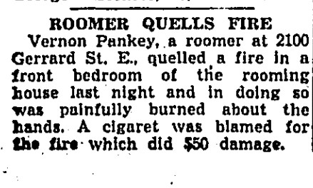 As I research the history of the neighbourhood from the beginning of the 20th century when the Ashbridge’s and Small estates were broken up for housing, I’m struck by just how many fires there were. This makes sense at a time when many houses were tarpaper shacks, built closely together in Shacktowns and even more substantial houses were had roofs of wooden shingles. Coal and wood fueled furnaces and chimney fires were common. So I’m posting some of those fires street by street. I start with Vernon Pankey on 2100 Gerrard Street East, injured in a fire on February 21, 1948, four years before I was born.