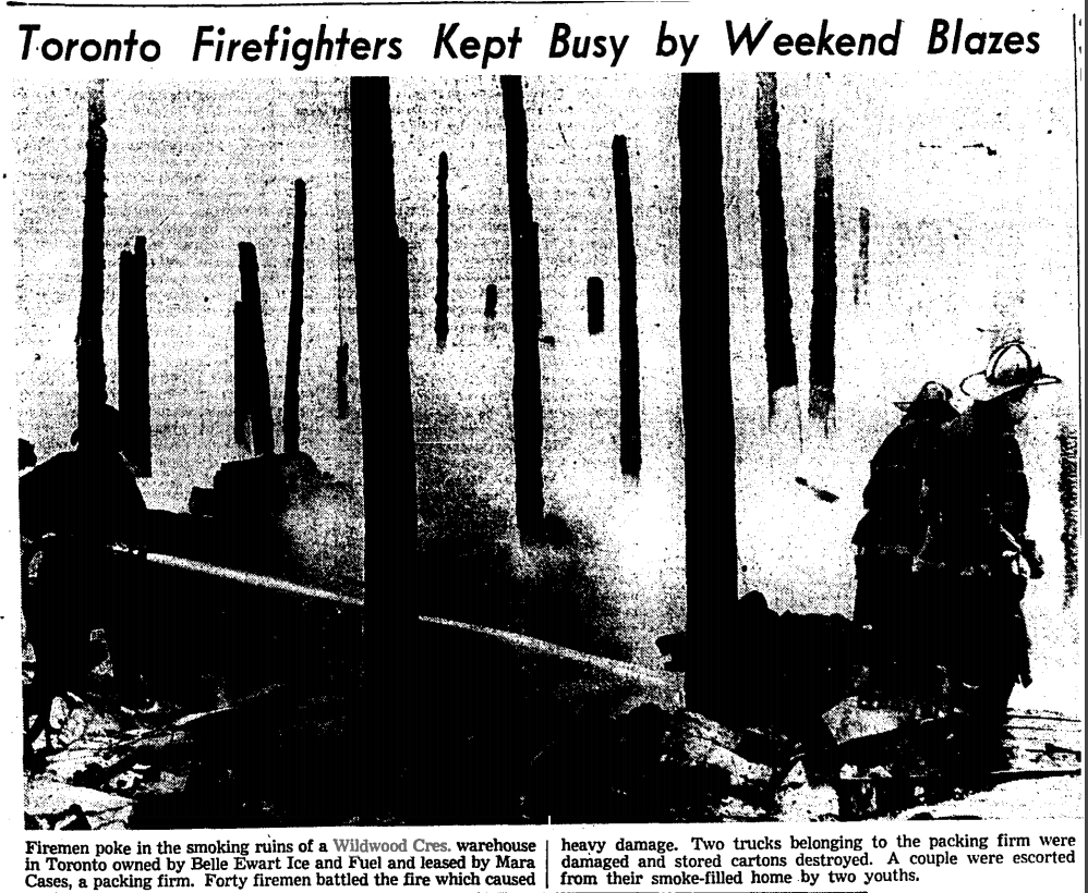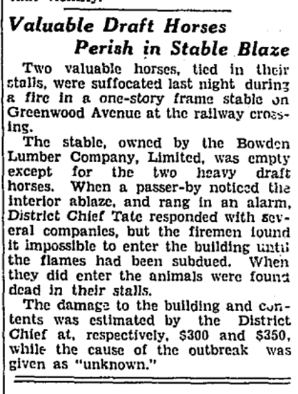 Belle Ewart was an ice company that used teams of horses to deliver ice across the city. Stables were and still are very vulnerable to fires with lots of hay and straw. Sometimes in hot weather fires even started by spontaneous combustion. And horses are notorious for panicking in a fire and need expert help to get out or they will run back into the flames. A barn or stable makes a death trap for livestock, horrifying to watch.