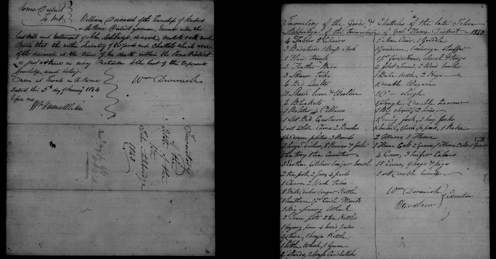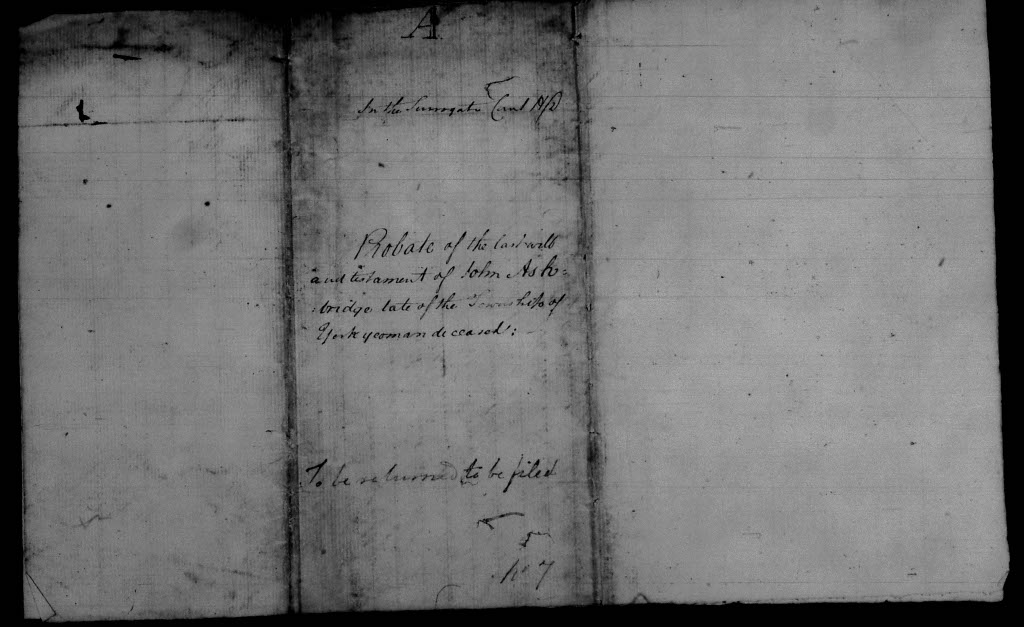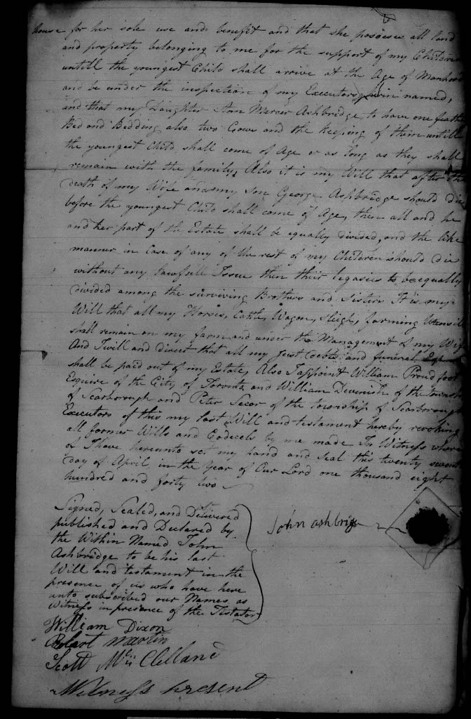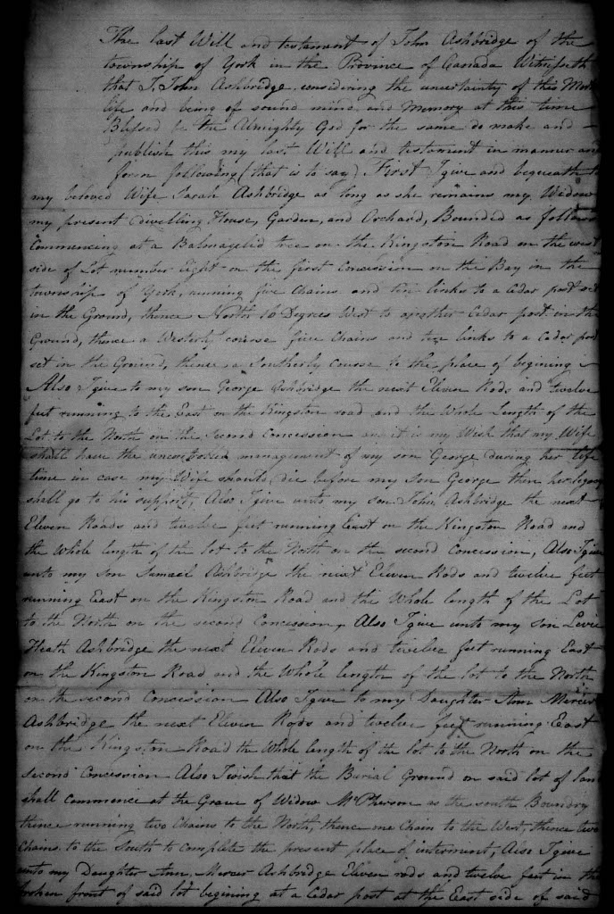 Here is the will of John Ashbridge (1761-1843). His mother, brother Jonathan and the rest of the family were the first settlers on the Ashbridge Estate.