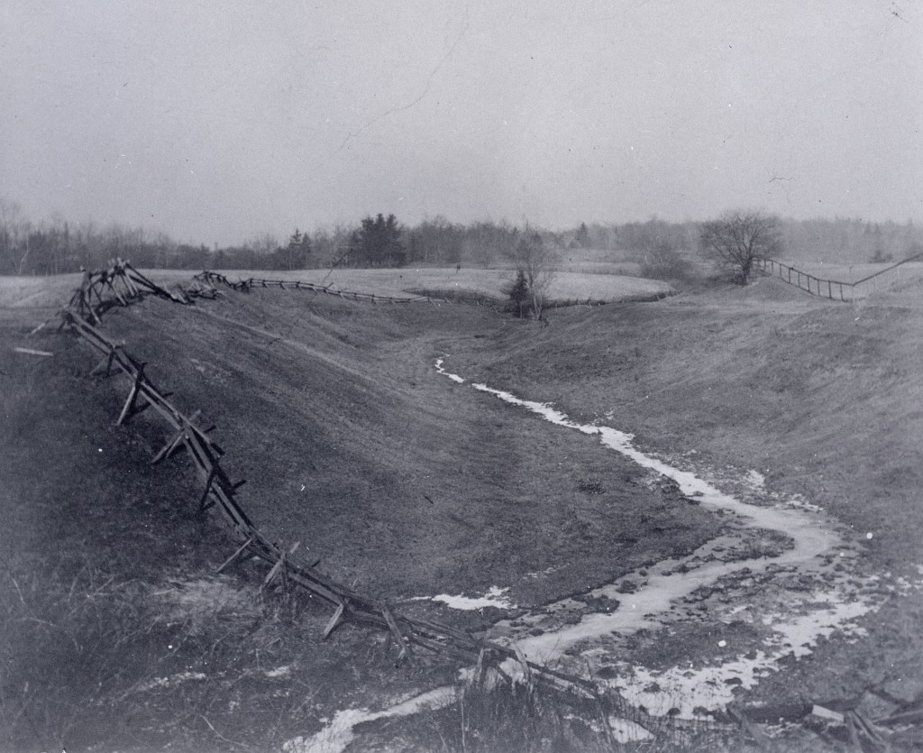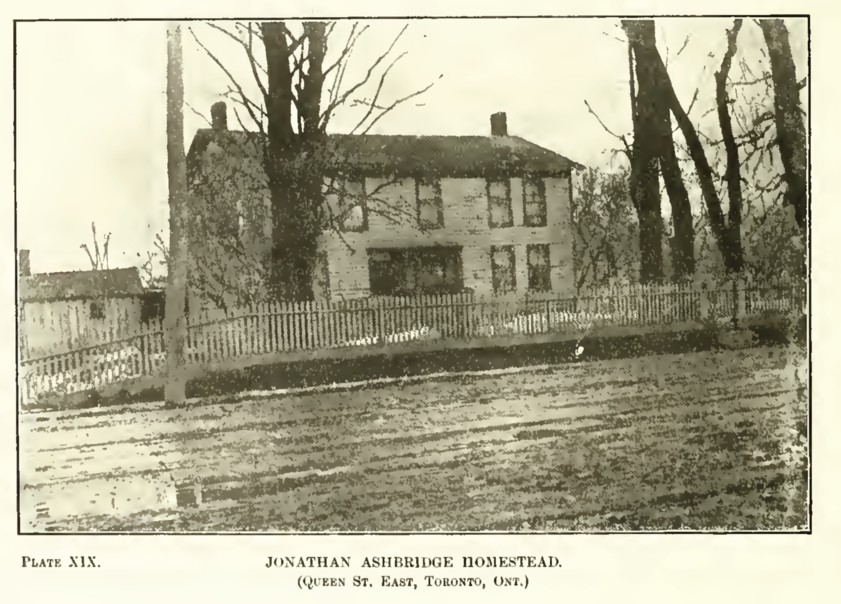 The frame house build at the northwest corner of Woodfield Road and Queen Street for John and Jonathan Ashbridge. This was a “double house” with separate quarters for the families of these brothers. It replaced the 1796 log cabins.1809 Ashbridge House1854 Ashbridge House, spring, 2010 photo by Joanne Doucette.Woodfield Rd., alongside Jesse Ashbridge farm, 1906, Toronto Public Library Digital College. Picture taken between Queen and Dundas (that part of Dundas was called Applegrove Avenue)Ashbridge Farm, looking north from Gerrard Street along what will later be Woodfield Road, 1906Ashbridges Estate, Robins ad, Toronto Star, April 2, 1908Ashbridge Estate September 29, 1955
